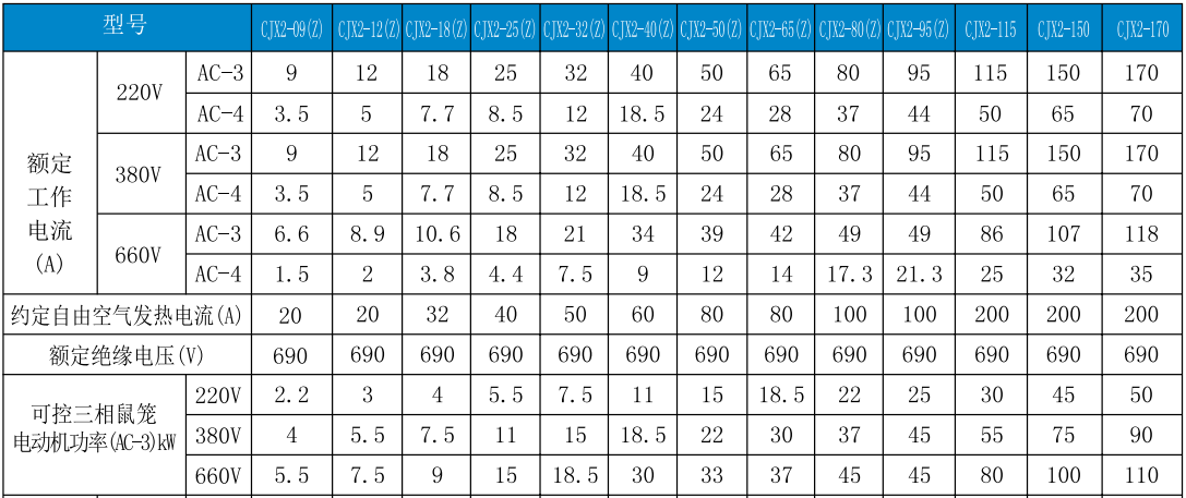 CJX2系列交流接触器(以下简称接触器),主要用于交流50Hz(或60Hz),电压至690V,电流至170A的电路中,供远距离接通和分断电路、频繁的起动和控制交流电动机之用,并可与适当的热继电器组成电磁起动器以保护可能发生操作过负荷的电路。
